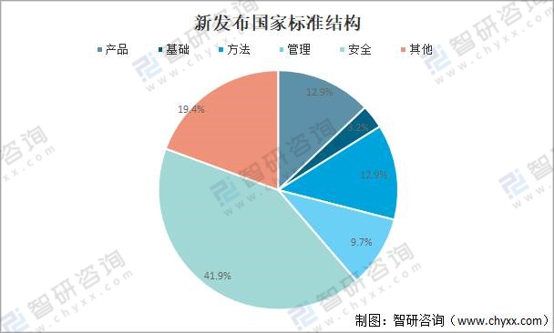 截至2020年末,完成制修订国家标准31项,其中产品类标准4项,占比12.9%;基础类标准1项,占比3.2%;方法类标准4项,占比12.9%;管理类标准3项,占比9.7%;安全类标准13项,占比41.9%;其他标准6项,占比19.4%。