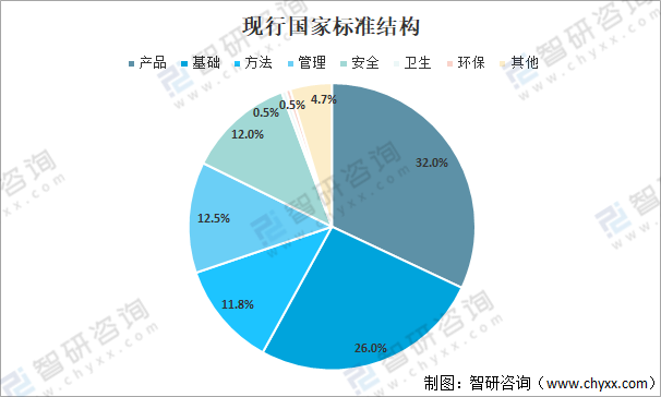 截至2020年末,现行国家标准共569项,其中产品类标准182项,占比32.0%;基础类标准148项,占比26.0%;方法类标准67项,占比11.8%;管理类标准71项,占比12.5%;安全类标准68项,占比12.0%,卫生类标准3项,占比0.5%;环保类标准3项,占比0.5%;其他标准25项,占比4.7%。