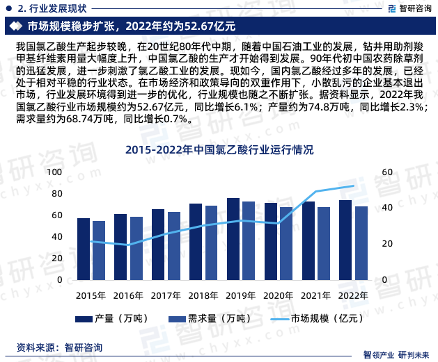 我国氯乙酸生产起步较晚,在20世纪80年代中期,随着中国石油工业的发展,钻井用助剂羧甲基纤维素用量大幅度上升,中国氯乙酸的生产才开始得到发展。90年代初中国农药除草剂的迅猛发展,进一步刺激了氯乙酸工业的发展。现如今,国内氯乙酸经过多年的发展,已经处于相对平稳的行业状态。在市场经济和政策导向的双重作用下,小散乱污的企业基本退出市场,行业发展环境得到进一步的优化,行业规模也随之不断扩张。据资料显示,2022年我国氯乙酸行业市场规模约为52.67亿元,同比增长6.1%;产量约为74.8万吨,同比增长2.3%;需求量约为68.74万吨,同比增长0.7%。