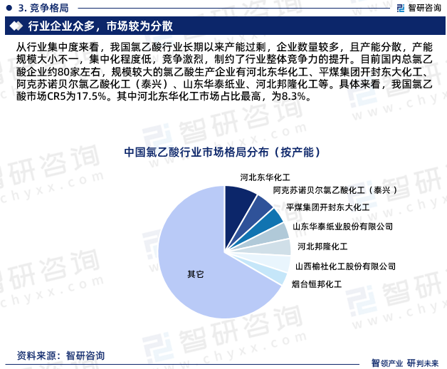 从行业集中度来看,我国氯乙酸行业长期以来产能过剩,企业数量较多,且产能分散,产能规模大小不一,集中化程度低,竞争激烈,制约了行业整体竞争力的提升。目前国内总氯乙酸企业约80家左右,规模较大的氯乙酸生产企业有河北东华化工、平煤集团开封东大化工、阿克苏诺贝尔氯乙酸化工(泰兴)、山东华泰纸业、河北邦隆化工等。具体来看,我国氯乙酸市场CR5为17.5%。其中河北东华化工市场占比最高,为8.3%。