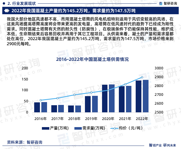 我国大部分地区风速都不高,而用混凝土塔筒的风电机组特别适用于风切变较高的风场,在这类风场提高塔筒高度将会带来更高的发电量,高塔筒在低风速时代的趋势下已经成为刚性需求。同时混凝土塔筒有天然的耐久性(防腐蚀),在极端条件下仍能保持其性能,维护成本低,生命期结束后容易回收并再用于其它工程项目。从供需来看,凝土的产量和需求量都处在高位,2022年我国混凝土产量约为145.2万吨,需求量约为147.5万吨,市场价格来到2900元每吨。