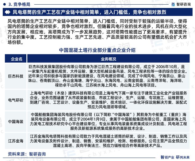 风电塔筒的生产工艺在产业链中相对简单,进入门槛低,同时受制于较强的运输半径,使得国内的塔筒企业相对较多,竞争也相对激烈。但随着风电行业的技术进步,风机在向大型化方向发展,相应地,高塔筒成为下一步发展趋势,这对塔筒性能提出了更高要求,有望提升行业的集中度。工艺控制能力强、生产工艺先进、产品质量较高的公司有望借此机会扩大市场份额。