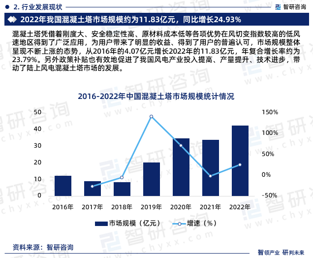 混凝土塔凭借着刚度大、安全稳定性高、原材料成本低等各项优势在风切变指数较高的低风速地区得到了广泛应用,为用户带来了明显的收益、得到了用户的普遍认可,市场规模整体呈现不断上涨的态势,从2016年的4.07亿元增长2022年的11.83亿元,年复合增长率约为23.79%。另外政策补贴也有效地促进了我国风电产业投入提高、产量提升、技术进步,带动了陆上风电混凝土塔市场的发展。