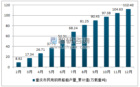 数据显示:2017年12月重庆市民用钢质船舶产量为7.79(万载重吨),2017年1-12月止累计重庆市民用钢质船舶产量为112.42(万载重吨)。