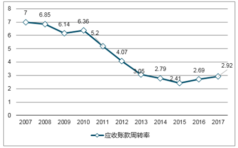 应收账款周转率近三年稳步回升,2017年为2.92