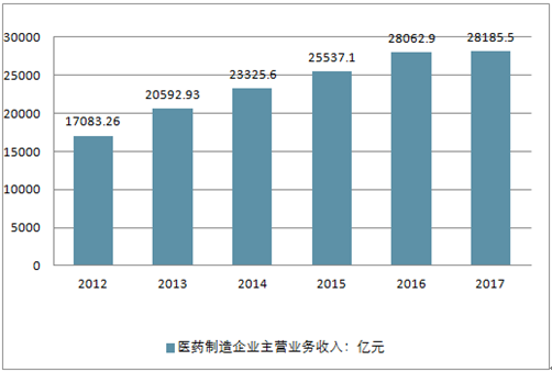 2017年全国医药制造业企业营业收入2.82万亿元, 实现利润总额3315.1亿元。