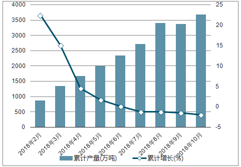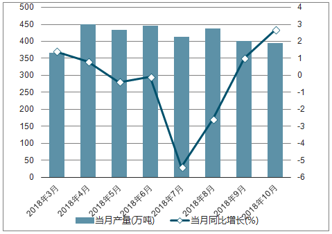 2018年2-10月中国铝材各月当月产量及同比增长走势