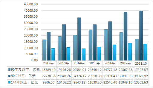 2018年1-10月我国90平及以下住宅投资规模为17127.37亿元,投资占比为24.34%;90-144平(不含90平)住宅投资规模为39879.92亿元;投资占比为56.67%;144平以上住宅投资规模为13362.63亿元;投资占比为18.99%。2012-2018年10月我国住宅投资规模结构分析