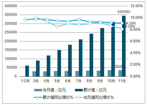 2018年11月份,社会消费品零售总额35260亿元,同比增长8.1%,增速比上月回落0.5个百分点。按经营单位所在地分,城镇消费品零售额29990亿元,同比增长7.9%;乡村消费品零售额5270亿元,增长9.3%。按消费类型分,餐饮收入4525亿元,增长8.6%;商品零售30735亿元,增长8.0%。