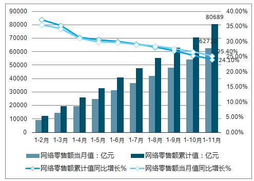 2018年11月份,网络零售总额80689亿元,同比增长24.10%。2018年1-11月份网络零售总额80689亿元,同比增长24.10%。