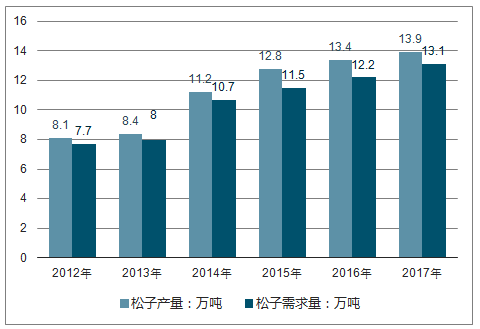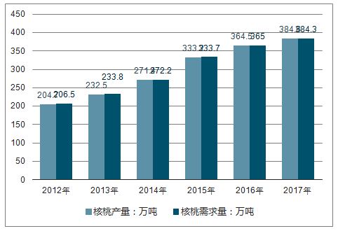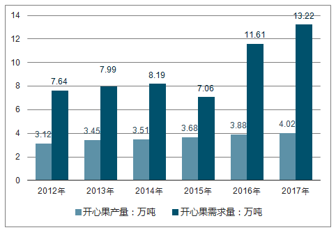 当今,现代医学再一次证明了坚果与籽类(为坚果、蔬菜、瓜果的籽粒)炒货食品的特殊营养价值。2007年美国FDA向全球公布:将坚果食品列为B级健康食品,提出坚果与籽类食品对人类具有5大健康功能: 1、富含营养和有益“脂肪”;2、提供具有生物活性的抗氧化物;3、促进抗氧化维生素和多酚的协同作用;4、有益于心脏健康;5、降低DNA氧化损伤。随着坚果与籽类营养知识的普及,人们对健康膳食的认知提高,坚果与籽类炒货食品已成为二十一世纪最受人们喜爱的健康休闲食品。由于我国经济的快速发展,人民生活水平的提高,营养知识的普及,坚果炒货行业得到迅速发展,特别是改革开放三十年以来,全行业呈现持续快速发展的态势。截止到2013年,规模以上企业销售收入近1000亿元,全行业约为2500亿元,每年持续以20%左右的幅度快速增长。坚果炒货行业在持续快速发展的同时,形成了一批以特色产品为特征的产业群:如安徽葵花子;兰州西瓜子;浙江山核桃;山东花生制品;云南、山西核桃;东北白瓜子、松子;新疆扁桃仁;河北杏仁等。在产业群形成的基础上,还形成了一大批广受消费者喜爱和欢迎的著名品牌,如洽洽、大好大、恒康、百联、真心、正林、阿里山、傻子、金鸽、徽记、阿明、姚生记、厚生记、良品铺子、口水娃、相府、森王等。先后诞生出全国坚果炒货行业综合经济(品牌)20强企业、绩效经济20强企业、最具发展潜力10强企业、诚信经营(含电商)10强企业、提供优质服务10强企业等。2012-2017年中国开心果产销量走势