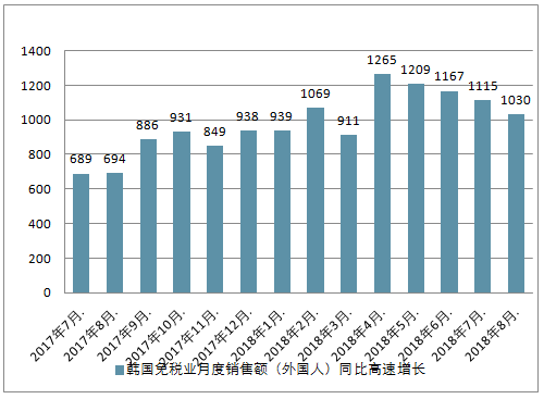 2018 年 6-7 月韩国免税业月度销售额(外国人)同比高速增长