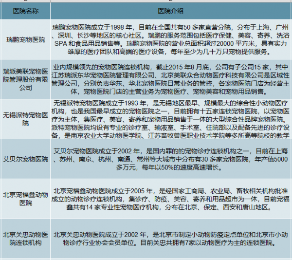 目前,我国规模较大的代表性宠物连锁医院主要有瑞鹏、瑞派、美联众合、派特、艾贝尔、我宠我爱、美联众合、宠福鑫、关忠、思威国际等,而这些品牌的宠物连锁医院也吸引着风投的关注。