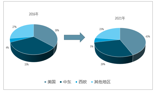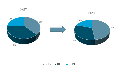 全球乙烷新增供给主要来自美国。2016年世界乙烷产量为6603万吨,其中95%左右来源于天然气凝析液(NGLs)分离。美国和中东乙烷产量分别占世界乙烷总产量的38%和36%。预计到2021年,随着美国页岩气生产量的进一步提升,美国和中东乙烷产量将分别占到全球48%和32%,资源集中度进一步提高。