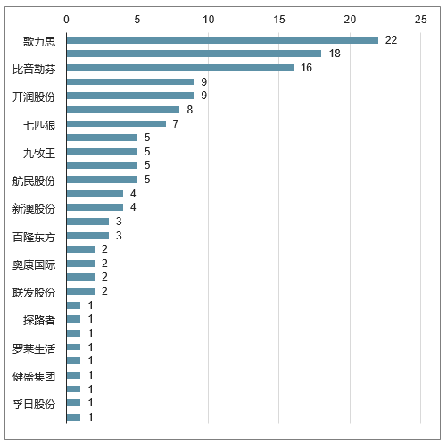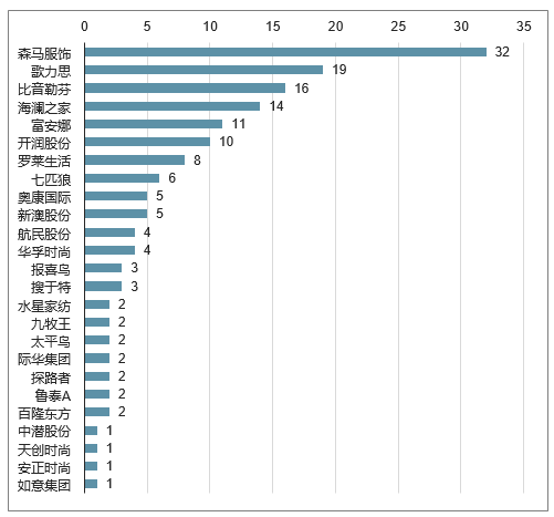 2018Q3 重仓数量的前十名公司 中,仅有七名与 2018Q4 重仓数量的前十名重合,罗莱生活、奥康国际和新澳股份的重仓 基金数量分别环比变动-7/-3/-1 个,未被列在 2018Q4 的前十名中。同时,2018Q3 排名第 二位的歌力思本期重仓基金数量增加 3 个,跃居第一位。2018Q3 排名第一的森马服饰和 排名第四位的海澜之家本期重仓基金数量环比减少相对较多,排名均有一定下滑。本期 板块重仓基金数量普遍增加不多,均在三个以内,反映在零售环境整体较为疲软的背景下投资信心尚未恢复,重仓基金数量增加的个股均为盈利较为确定的行业龙头以及分红 稳定的公司。纺织服装行业上市公司较 2018Q3 重仓基金数量变动情况2018Q3纺织服装行业基金重仓数量排名