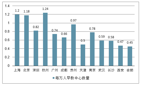 国内早教市场目前一线城市最为发达, 以上海地区为例,按照大众点评的早教中心数量统计,截止到 2019 年 1 年月 9 日上海有 2892 家早教中心、北 京为 2559 家早教中心,上海、北京、深圳之外的二线城市,在早教中心的数量上相比一线城市仍有较大差距。 从每万人早教中心数量来看,经济发达的一二线城市上海、北京、杭州、深圳、苏州分别为 1.2、1.18、1.24、 0.81、0.97 家,经济中等的二线城市武汉、长沙、西安、合肥每万人早教中心数量分别为 0.59、0.58、0.47、0.45 家,差距较为明显。若以 2018 年上海地区早教市场 57%的渗透率作为基数,假设各地出生率相差不大的前提下, 以总人口为参考值,则经济发达的一二线城市上海、北京、杭州、深圳、苏州的早教渗透率分别为 57%、56%、 59%、39%、46%,经济中等的二线城市武汉、长沙、西安、合肥早教渗透率分别为 28%、28%、22%、21%,伴 随人均收入的提升,早教市场在二三线城市仍有巨大空间。