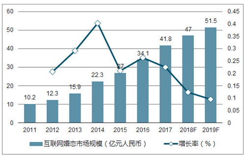 2016年我国互联网婚恋交友市场规模为34.1亿元,较2015年增长26.3%,预计至2019年中国互联网婚恋交友市场规模将超过51.5亿元,未来中国互联网婚恋交友市场将保持较高的增长速度。