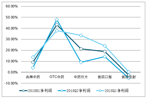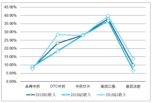 据品牌、终端以及剂型等因素,大致将中药行业可细分为传统中药、OTC中药、医院口服及医院注射 四大类,具体收入及利润变化情况如下。 品牌中药,行业增速进入5-10%区间,还需继续观察下半年变化。上半年龙头公司云南白药、东阿阿 胶半年业绩均低于预期,分析其主要原因为进入渠道调整阶段,预计行业全年收入增速或在10%左右; OTC中药,增速整体快。该数据受白云山影响较大,若剔除该标的后,上半年收入和利润增速分别约 为19.8%、21%,单季度来看,Q1和Q2收入增长分别为13.2%和27.6%,净利润增长分别为25.8%和 17%,有下滑趋势; 中药饮片,继续高增长。由于行业样本公司仅两家,数据波动受康美药业影响较大; 医院口服,收入增速远快于利润。受销售模式调整,部分企业出厂价提升,但净利润增速平稳。Q2 增速下滑幅度较大原因为部分企业增加了销售费用; 医院注射,业绩下滑。除了与医院口服剂型有相同的销售政策变化外,注射剂还面临着销量及价格下 降,前景不看好。