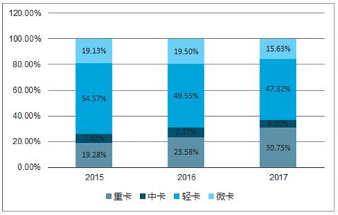从卡车细分市场来看,重卡的市场份额逐年扩张,而轻卡的市场份额持续缩减。