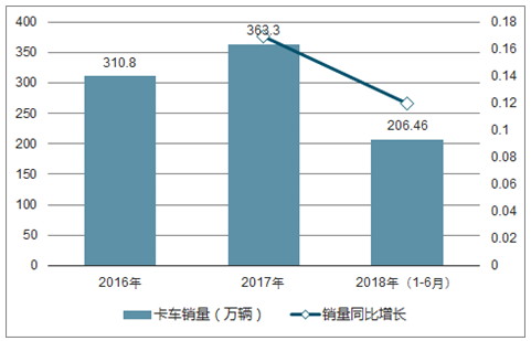 图表:2014-2018年我国卡车行业工业销售产值及增长对比