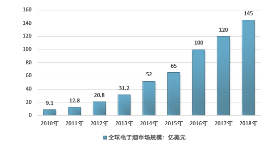 根据最新统计数据,全球电子烟市场规模2018年达到145亿美元。电子烟市场将可能在未来十年内,超越传统烟草市场,预计至 2030 年全球电子烟销售将增长 17 倍2011-2018年全球雾化式电子烟市场规模走势