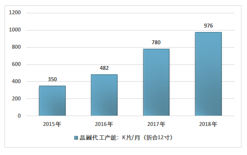 近几年,我国晶圆代工厂产能快速增长,从2015年的350K增长到2018年的976K。如下图所示: