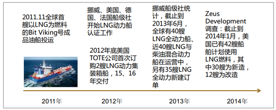 2011 年以第一艘 LNG 燃料成品油船投运为标准,国际 LNG 燃料动力船舶市场开始启动,以新造船舶为主。