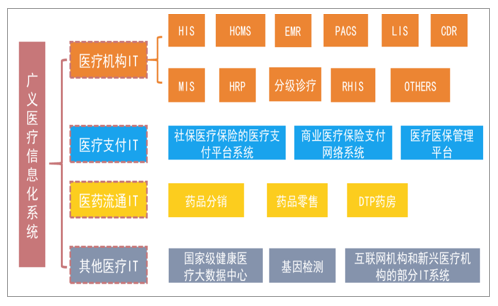 广义的医疗IT包括医疗机构IT系统、医疗支付平台IT、医药流通IT和其他医疗IT。