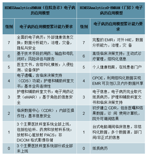 HIMSS电子病历评级标准。HIMSS旗下子公司HIMSSAnalytics于2005年开发了电子病历采纳模式(SM),用来评价HIMSSAnalytics®数据库中医院电子病历系统的进展和影响。通过跟踪其完成8个等级(0-7级)的进展,医院可以审查对信息技术应用的实施和利用状况,目标是达到7级水平,7级代表着先进的电子病历环境。HIMSS将电子病历分为住院急诊(EMRAM)和门诊(O-EMRAM)两类。每一类都分为8个等级(0-7级)。