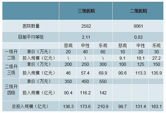 市场增量测算。根据2019年2月卫健委的最新数据,我国有2582家三级医院,9061家二级医院。如果满足卫健委关于电子病历的相关要求,中性条件下,2019-2020年二级医院需求增量131亿元,三级医院需求增量174亿元,共300亿市场增量。