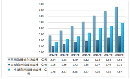 2018年我国商用洗碗机行业市场规模约7.58亿元,其中,大型商用洗碗机规模约2.71亿元,中小型商用洗碗机规模4.87亿元,如下图所示:
