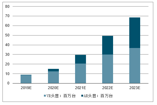 龙头公司进入VRAR设备市场,有望改写2016年以来整体市场低迷的状态。同时,伴随着5G到来,VR/AR逐步向云VR/AR形态过渡,行业有望重新进入发展期。根据预测,2023年全球市场VR/AR头显出货量有望达到近7000万台,其中VR头显出货量将达3670万台,AR头显出货量将达3190万台。