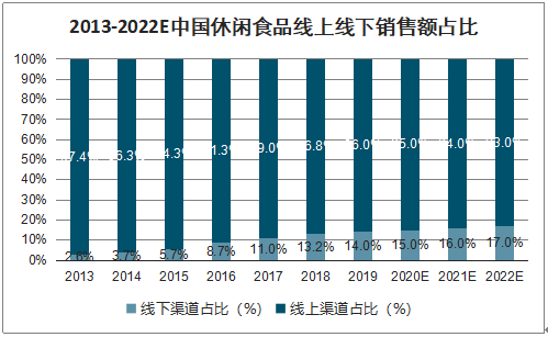 食品电商发展逐渐成熟。线上消费由于突破了品类及地域的限制、便捷高效的配送体验,及扁平化渠道结构带来的更具竞争力的价格优势,迎合了新一代消费者的诉求。我国食品电商行业历经2005-2009年的探索期、2009-2012年的启动期,目前正处于发展、成熟期。中国休闲食品销售额线上占比由2013年的2.6%上升至2018年的13.2%,并将在未来继续提升,预计2022年线上占比将达17.0%。2013-2022E中国休闲食品线上线下销售额占比