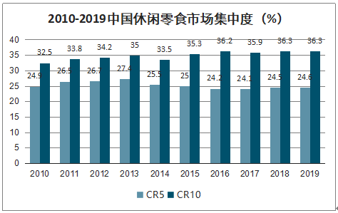 休闲食品行业进入门槛相对较低,主体数量众多,产品同质化较严重。2019年中国休闲零食市场CR5和CR10分别为24.6%和36.3%,市场集中度仍较低。部分优质企业开始利用研发优势,推出顺应市场需求的休闲食品,开拓新增长点,巩固行业竞争力和市场地位。