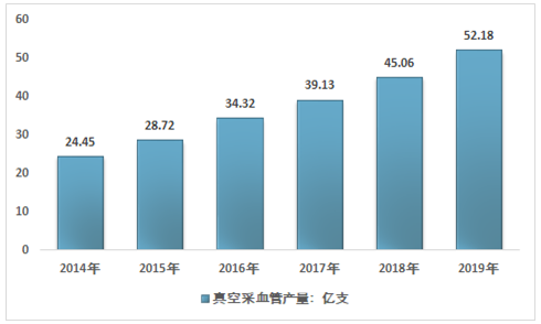 近几年,我国真空采血管产量快速增长,从2014年的24.45亿支增长到了2019年的52.18亿支。近几年我国真空采血管产量情况如下图所示: