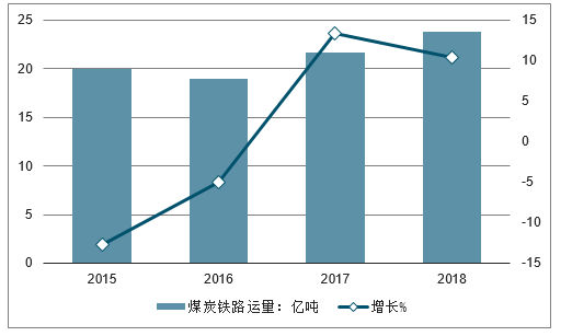 2016-2018年中国煤炭铁路运量及增长(单位:亿吨,%)
