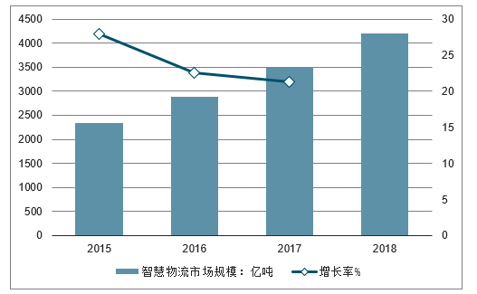 2016-2018年中国智慧物流行业市场规模及增长(单位:亿吨,%)