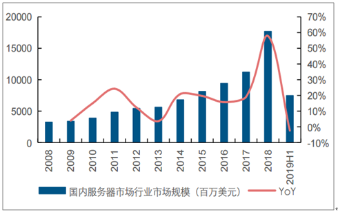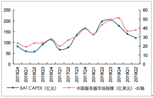 全球IT企业的资本开支在2019H1普遍收缩。2019Q1FAMGA的CAPEX同比下降18.62%,是近13个季度首次出现负增长。而国内市场,三大互联网巨头BAT资本开支增速从2018Q3开始出现大幅下跌,到2019Q2单季度同比下降38.86%。从2018Q4开始,服务器行业打破了过去几年的高景气度,走势出现疲软。到2019Q2,国内服务器市场销售额同比下降13%,出现明显萎缩态势。