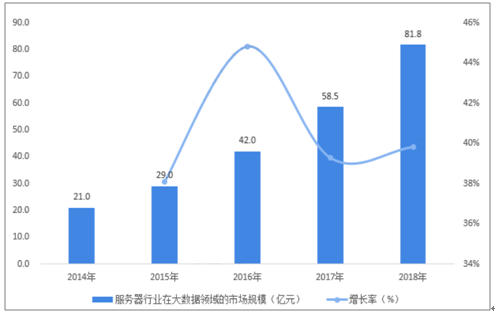 2014-2018年服务器行业在大数据领域的市场规模(单位:亿元,%)