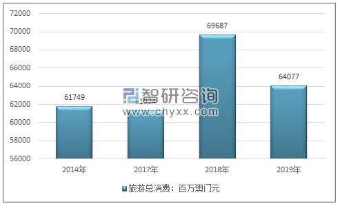 国家“十二五”“十三五”规划明确了澳门“世界旅游休闲中心”定位,这意味着澳门旅游业未来要朝着国际化、高端化的方向迈进。2019年,澳门地区游客消费64077百万澳门元。