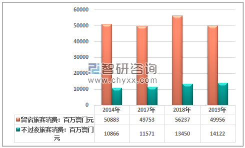 2014-2019年澳门地区留宿旅客消费及不过夜旅客消费金额统计
