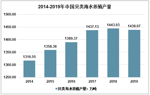 贝类养殖是我国海水养殖产业的重要组成部分。近年来,贝类产业在种质创新、健康养殖、精深加工等关键技术上取得了长足进步。2014年,贝类海水养殖产量1316.55万吨,2018年增长到1443.93万吨,2019年略有下降达1438.97万吨。近年来国内贝类海水养殖情况如下:
