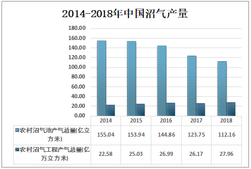 2018年中国农村沼气池产气总量为112.16亿立方米,农村沼气工程产气总量为27.96亿立方米。