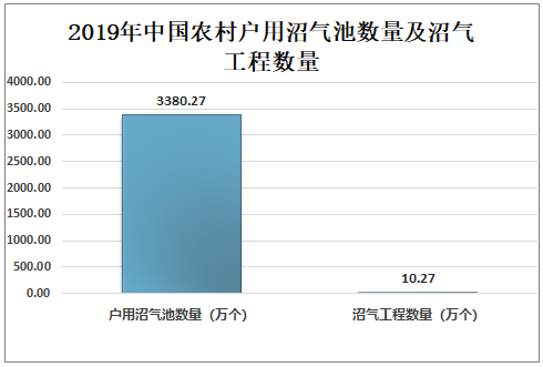 中国的沼气建设取得了举世公认的成绩,为解决农民生活燃料、改善农村生态环境、繁荣农村经济做出了贡献。随着中国农业进入新的发展阶段,农村沼气建设对促进农业结构调整、农业增收和生态建设所起作用日益突出,产生了良好的综合效益。2019年中国农村户用沼气池数量为3380.27万个,沼气工程数量为10.27万个。2019年中国农村户用沼气池数量及沼气工程数量