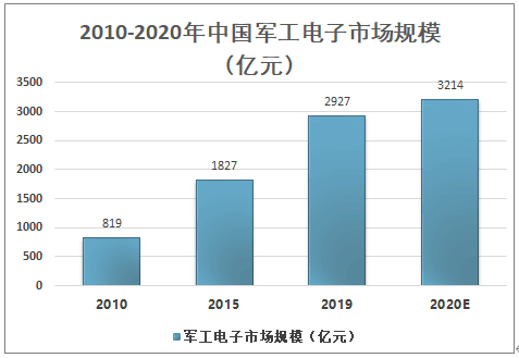 预计2020年中国军工电子市场规模为3214亿元,同比增长9.8%。