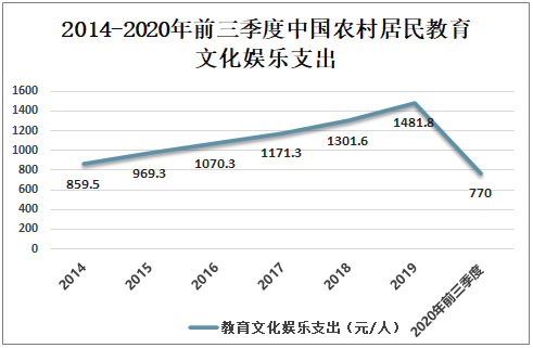 近些年,在国家优先发展乡村教育政策的支持下,倾斜支持农村教育、中西部地区教育,实施农村寄宿制学校建设工程、全面改薄、教育脱贫攻坚等重大工程项目,全国超过80%的县实现义务教育基本均衡发展,更多农村和中西部地区孩子享受到更好更公平的教育,乡村教育整体面貌发生了根本性变化,乡村教育发展取得了历史性成就。2014-2019年中国农村居民教育文化娱乐支出不断增加,由2014年的859.5元/人增长至2019年的1481.8元/人,2020年前三季度中国农村居民教育文化娱乐支出为770元/人。2014-2020年前三季度中国农村居民教育文化娱乐支出
