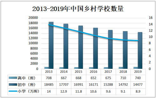 由于乡村社会经济发展缓慢,整个乡村始终处于发展劣势,乡村教育置身其中难以超然物外,也无力扭转现有局面;再加上乡村学校地理位置偏僻、物质条件匮乏、基础设施不完善,在解决温饱之后,缺乏生活层次提升和便利性规划,无法满足师生日常生活需求和精神追求,因此中国乡村初中及小学学校数量逐年下降,2019年中国乡村共有740所高中,14477所初中,8.9万所小学。