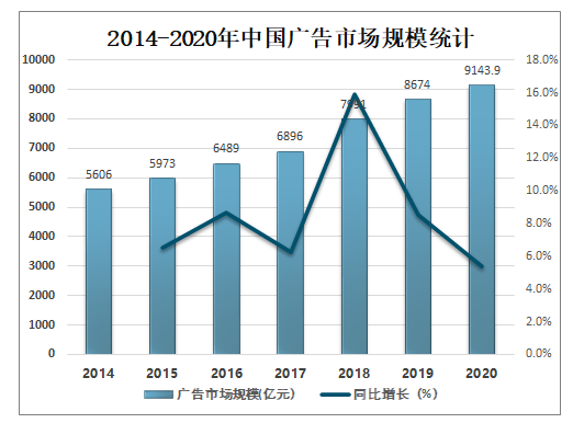 2020年中国广告市场规模达9143.9亿元,较2019年增加了469.9亿元,同比增长5.4%。