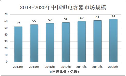中国钽电容器市场规模不断扩大,2019年中国钽电容器市场规模为61亿元,2020年中国钽电容器市场规模约为63亿元。
