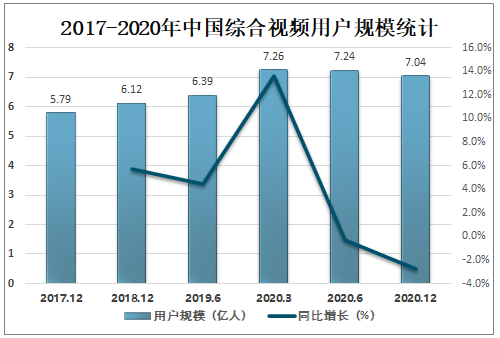 截止2020年3月底中国综合视频用户规模达7.26亿人,随着疫情防控进入常态化阶段,中国综合视频用户规模开始下滑,截止2020年12月中国综合视频用户规模为7.04亿人,较2020年6月底减少了0.2亿人,同比减少2.8%。